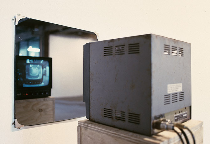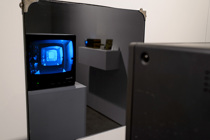 Here, now, infinitely there use simple surveillance technology, mirrors and monitors to evoke what he calls ‘the panopticon subjected to its own gaze’. His works contemplate the invisible power structures at work and the dualities of fear and passive complicity in the observational process.