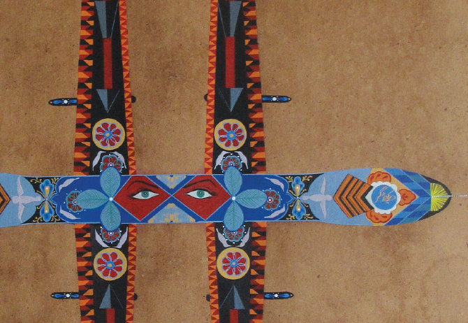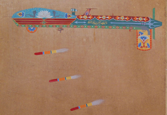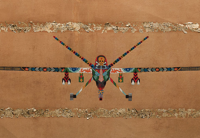 Unauthorised incursions by unmanned aircraft have become commonplace in North-West Pakistan since the United States declared 'War On Terror'. Mahwish Chishty's paintings of CIA surveillance and attack drones are intricately rendered in the elaborate and colourful Pakistani folk-tradition of truck decoration. This style of decoration proudly reflects the personality of each truck driver—in contrast to the unadorned, drab grey exteriors of actual drones that reveal nothing about their far-distant operators.