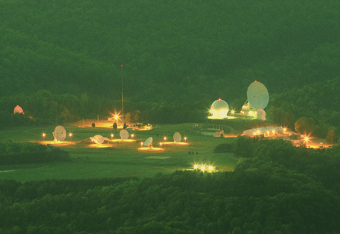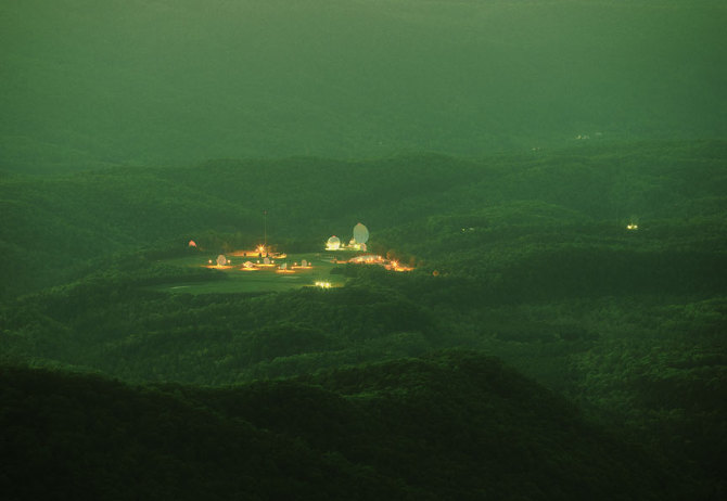 They Watch the Moon depicts a secret NSA listening station deep in the forests of West Virginia. The station is at the centre of the National Radio Quiet Zone, a region of approximately 34,000 square kilometres in West Virginia and parts of Maryland. Within the Quiet Zone, WiFi, FM radio and similar transmissions are not permitted so that astronomers can use sensitive radio telescopes to observe distant galaxies. The listening station, which forms part of the global ECHELON system, was designed in part to take advantage of a phenomenon called 'moonbounce' (capturing communications and telemetry signals from around the world as they escape into space, hit the moon, and are reflected back towards Earth). The photograph is a long exposure under the full moon.