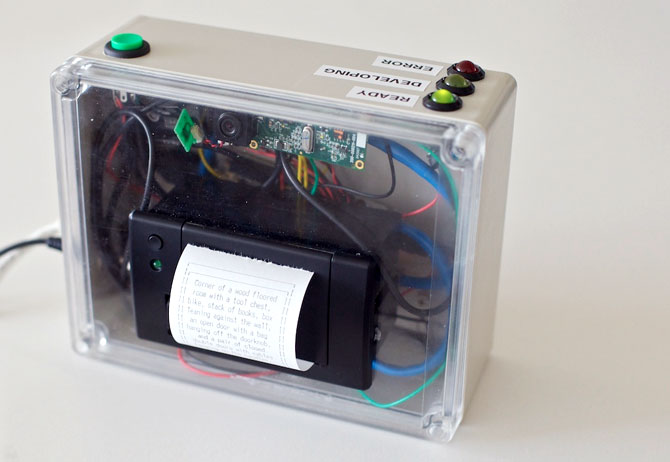 Descriptive Camera functions like a regular camera, but instead of producing visual images it outputs written descriptions of what it sees. To generate output, the camera takes photographs of a scene and uploads the files to a web service that assigns ‘human intelligence tasks’ to workers from various locations around the world. One of these workers analyses the image and writes a short written description that is then output by a receipt printer built into the camera. Like the process of intelligence analysis, the method of generating output for the
